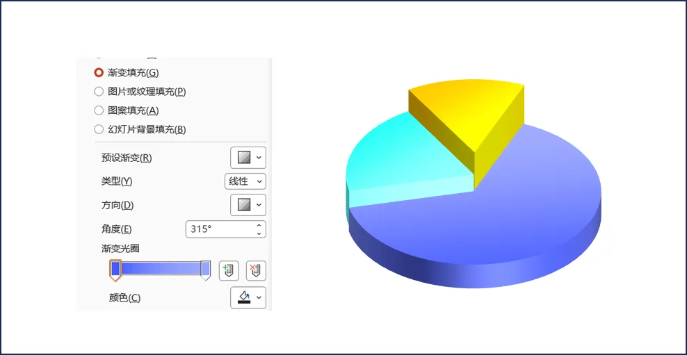 5,最后就是美化啦!分别给扇形设置渐变色,渐变的颜色可以参考下图,也可以根据自己的喜好进行调整,接着把数据标签还有文字标题等都添加上去,这样就搞定一页高级感满的立体饼图啦!