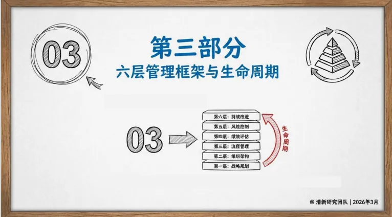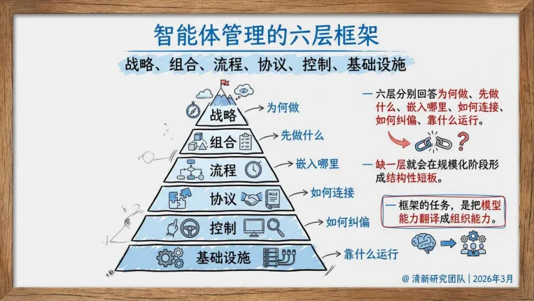 3. 缺一层管理框架,规模化就一定会失速。报告给出六层管理框架—— 战略、组合、流程、协议、控制、基础设施,缺一不可。它的作用只有一个:把零散的模型能力,翻译成真正的组织能力。没有这套框架,AI 永远是小工具、小试点;有了这套框架,AI 才是可复制、可经营、可盈利的生产力。