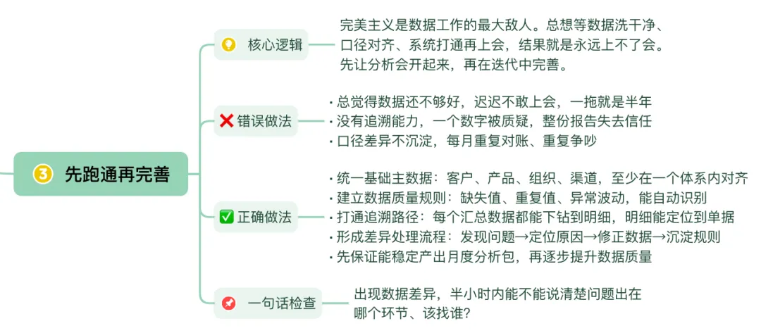 完美主义是数据工作的最大敌人。总想等数据洗干净、口径对齐、系统打通再上会,结果就是永远上不了会。先让分析会开起来,再在迭代中完善。