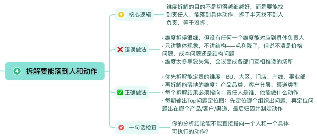 维度拆解的目的不是切得越细越好,而是要能找到责任人、能落到具体动作。拆了半天找不到人负责,等于没拆。