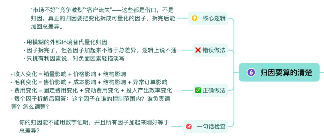 “市场不好”“竞争激烈”“客户流失”——这些都是借口,不是归因。真正的归因要把变化拆成可量化的因子,拆完后能加回总差异。