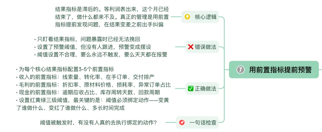 结果指标是滞后的。等利润表出来,这个月已经结束了,做什么都来不及。真正的管理是用前置指标提前发现问题,在结果变差之前出手纠偏。