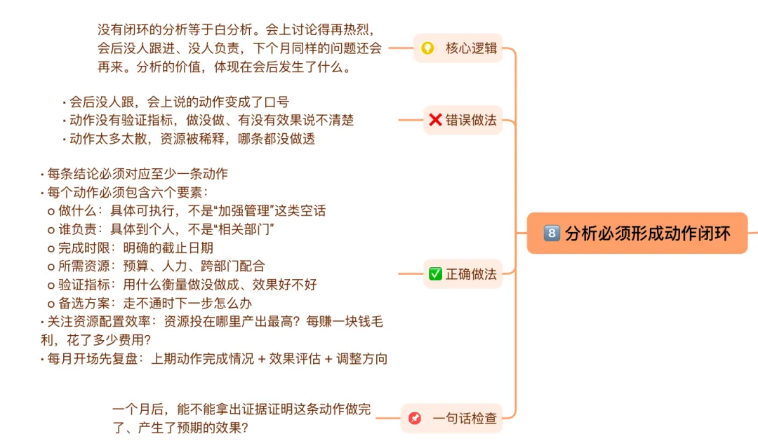没有闭环的分析等于白分析。会上讨论得再热烈,会后没人跟进、没人负责,下个月同样的问题还会再来。分析的价值,体现在会后发生了什么。
