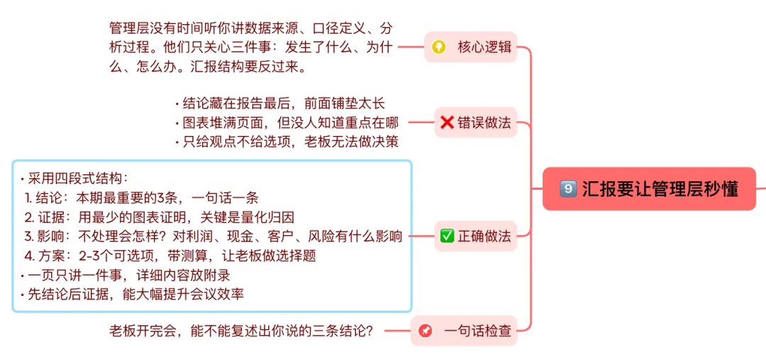 管理层没有时间听你讲数据来源、口径定义、分析过程。他们只关心三件事:发生了什么、为什么、怎么办。汇报结构要反过来。