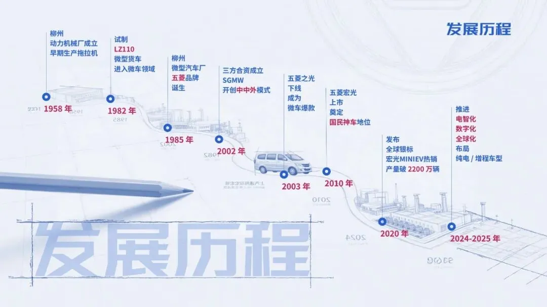 - 时间线设计,勾勒企业发展脉络:将五菱六十余年的发展历程与线稿风格融合,打造线性视觉时间线,让企业的发展脉络直观清晰,既体现了品牌的历史厚重感,又让工业精致感贯穿始终。