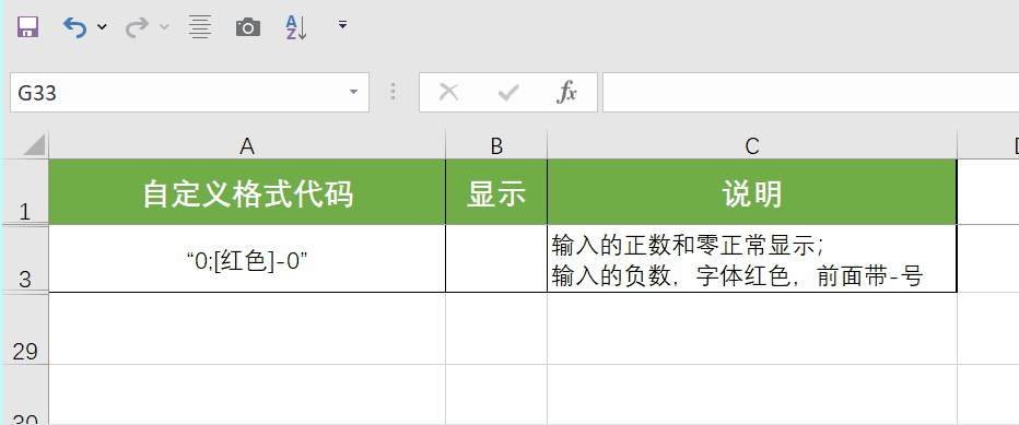 2段式:第1段对应正数+零值,第2段对应负数,例如设定格式为“0;[红色]-0”,第一个分号前的0表示正数和0的格式,如果输入的是正数或0,则正常显示;分号后边的“[红色]-0”表示负数的格式,如输入的是一个负数,显示为红色且带负号。
