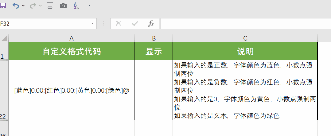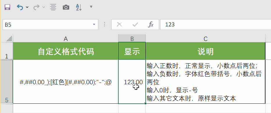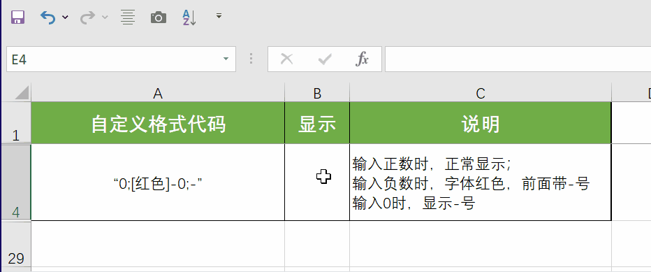 3段式:第1段对应正数,第2段对应负数,第3段对应零值,例如“0;[红色]-0;-”,第1个分号前的0是正数的格式,表示正数正常显示,第2个分号前的“[红色]-0”是负数的格式,表示输入的负数红色+负号显示,第2个分号后的-是0的格式,表示输入的零值显示为短横线。