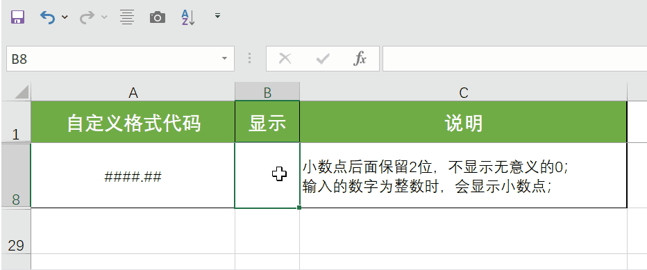 (2) 有效数字占位数#:只显示有意义的数字,不显示无意义的零。例如格式“####.##”,输入123.4会显示123.4,输入123.00会显示123.,(注意输入123.00时会显示123.,末尾有个小数点,隐藏小数点另有方法,本例只讲占位符)。