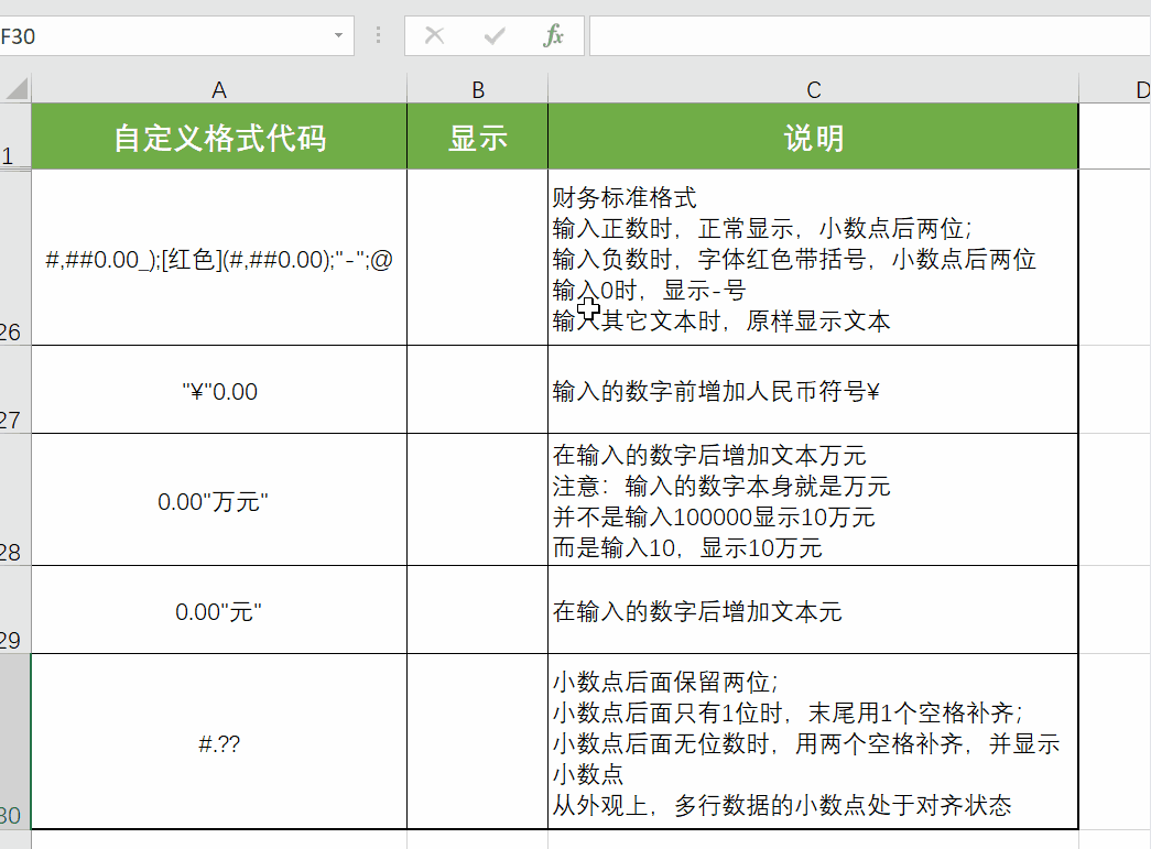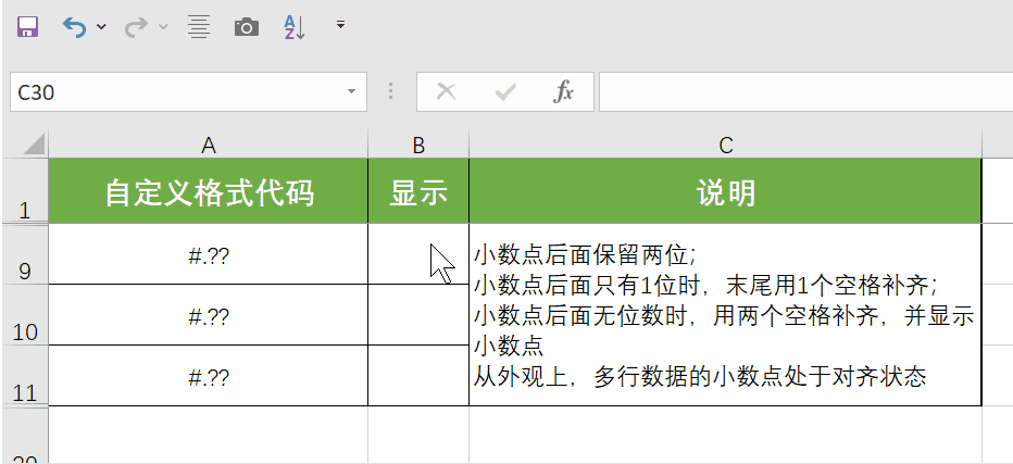 (3) 空格占位符?:不足位数时用空格补齐,比如输入12.30时,末尾的0用空格代替,使上下行的小数点对齐,适合需要统一对齐的数值对比场景(如财务报表中的金额对比)。