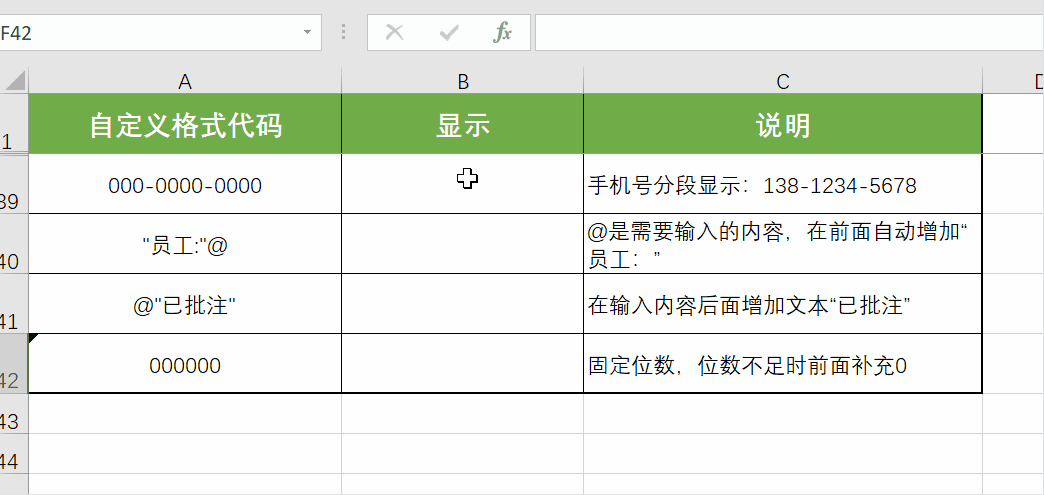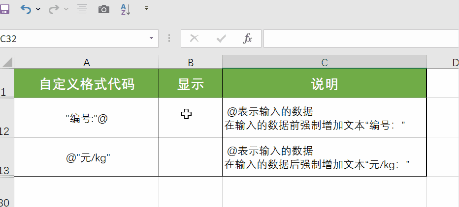 (2) 英文双引号"":包裹固定文本,用于给数据添加固定前缀、后缀或单位。如上例中“编号:”为固定文本,需用双引号包裹;格式“0"kg"”,输入5会显示“5kg”,其中的单位kg也是固定文本,需用双引号包裹。注意必须使用英文双引号,中文双引号会导致格式失效。