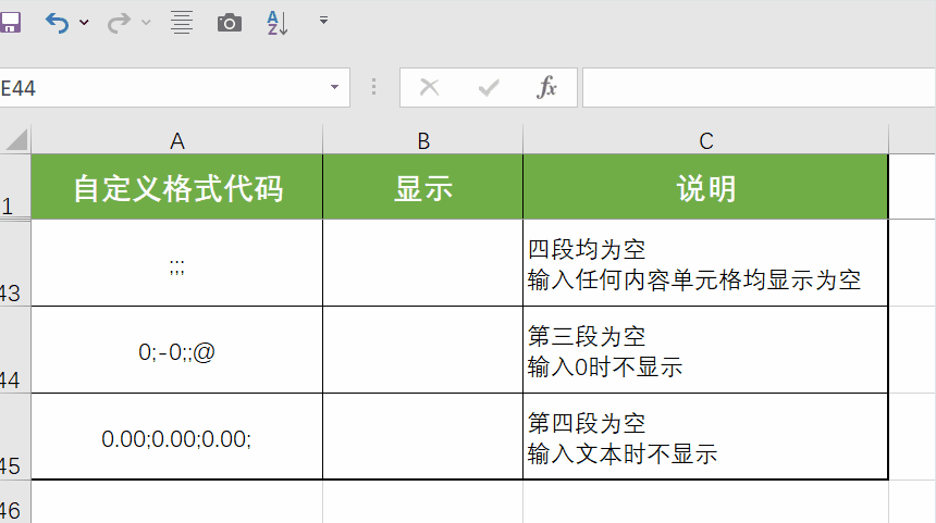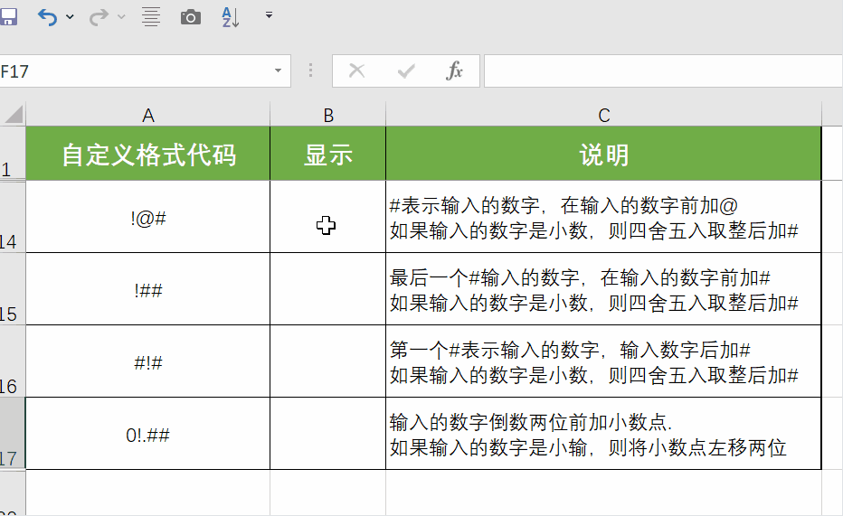 (3) 强制显示符!:转义字符,强制显示感叹号后面的符号,将其作为普通文本,而非特殊符号。例如“!#”会显示#,“!.”会强制显示小数点,避免其被Excel识别为小数分隔符。