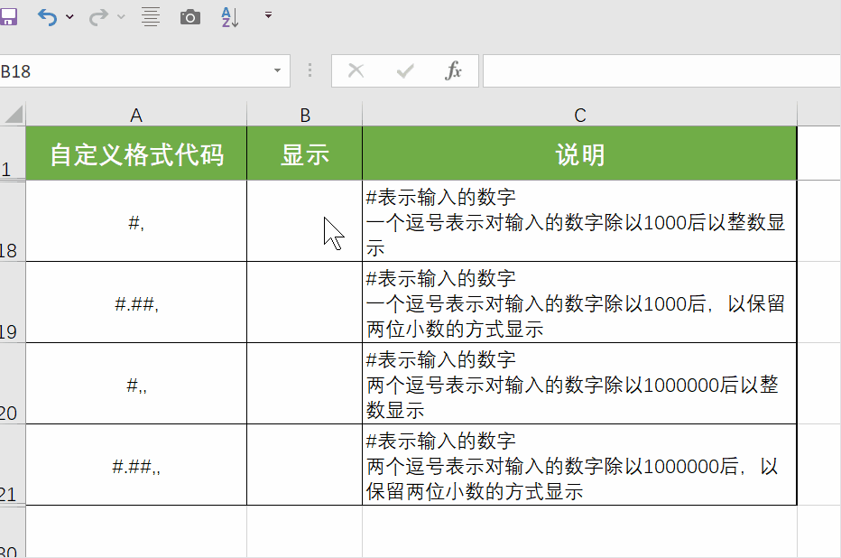 (4) 千分位分隔符,(英文逗号):同时具备“缩放数字”的功能——1个逗号代表除以1000,即输入的数字除以1000后显示,2个逗号代表除以1000000(百万),即输入的数字除以1000000后显示。