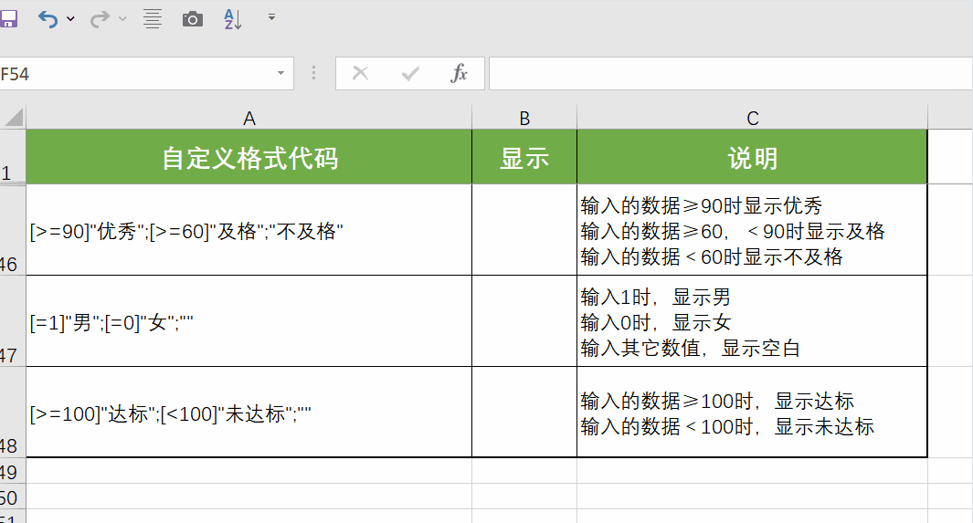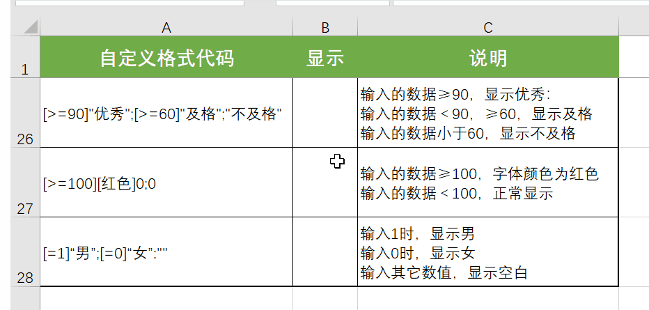 [>=90]"优秀";[>=60]"及格";"不及格" | 输入的数据≥90时显示优秀 输入的数据≥60,<90时显示及格 输入的数据<60时显示不及格 | |