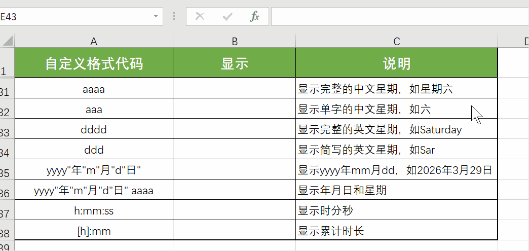 上面演示动画中,第一个输入7,显示的是星期六;最后一项[h],h用中括号包裹,其原因请翻阅我前面的文章。点击查看前面的文章