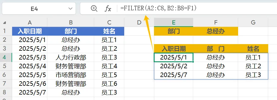 E2=FILTER(A2:C8,(B2:B8="财务管理部")+(B2:B8="人力行政部"))