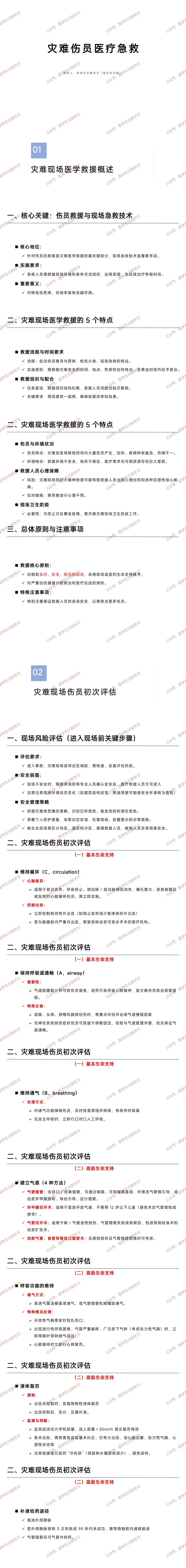 救援流程与时间要求:流程涵盖伤员搜寻营救、检伤分类、现场急救和转运;需结合灾难发生时间、地点、性质及创伤特点,在黄金时间内救治。