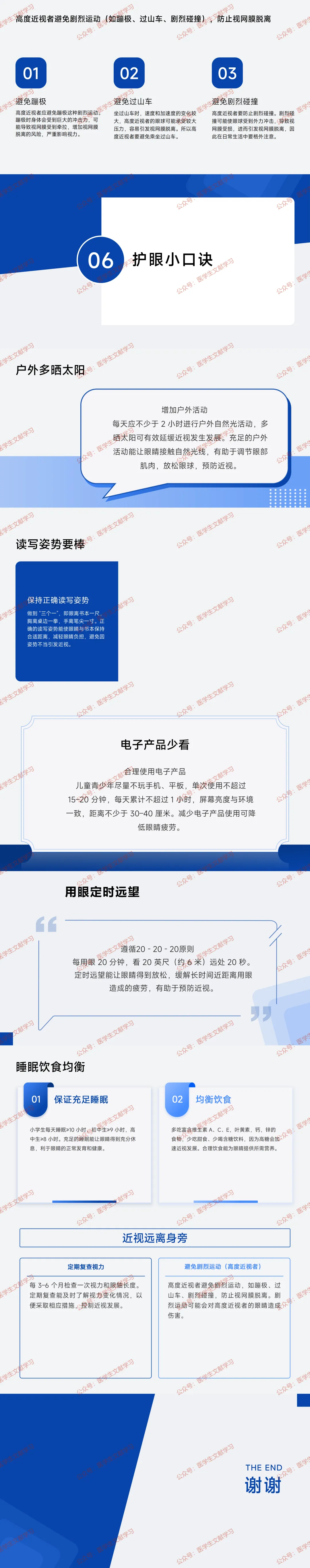 - 高度近视者避免蹦极、过山车、剧烈碰撞等运动,预防视网膜脱离