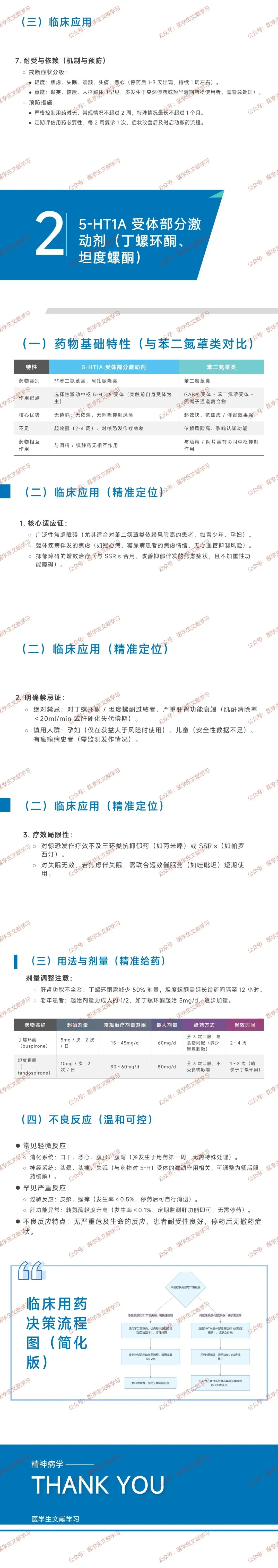 - 特殊人群:青少年、孕妇、物质滥用史者,优先用 5-HT1A 受体部分激动剂。