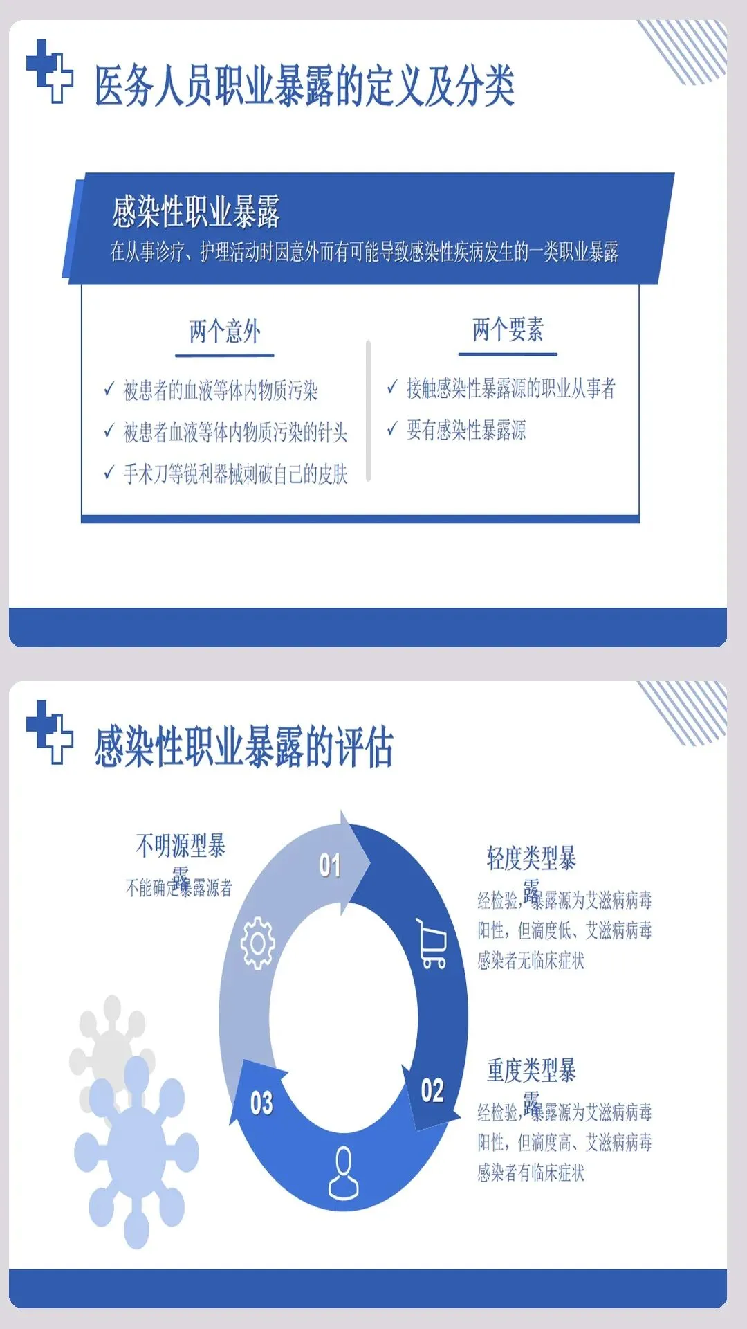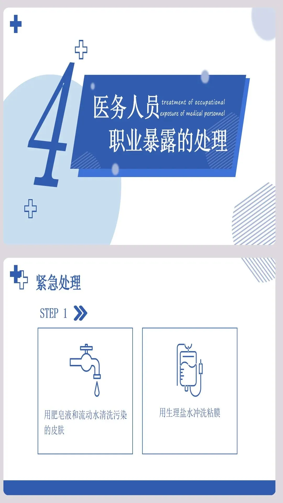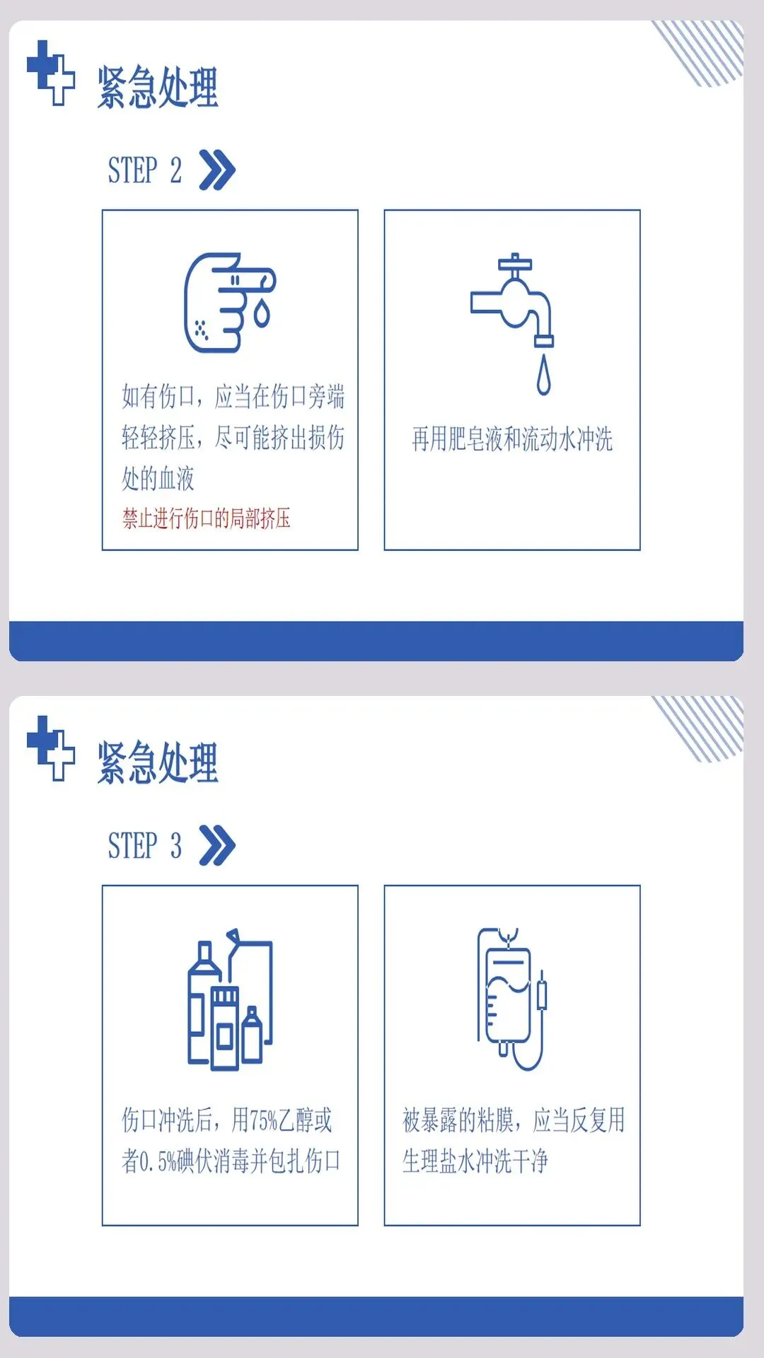 万一不幸发生了暴露,比如被针头扎伤了,我们该怎么办?千万别慌,记住三个步骤:第一,冲洗,用肥皂水和流动水清洗伤口,用生理盐水冲洗粘膜;第二,挤血,从伤口的近心端向远心端轻轻挤压,尽可能挤出损伤处的血液,但千万禁止局部挤压;第三,消毒,用碘伏或酒精消毒并包扎。处理完伤口后,一定要及时上报,进行风险评估,必要时采取阻断治疗。