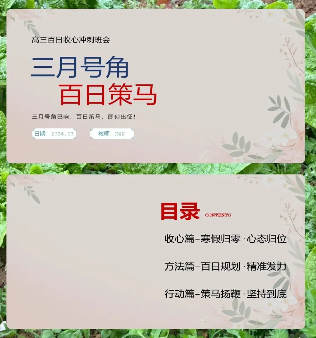 一百天,老师、家长都是你们的后盾,但最终上考场的是你们自己,能赢的也是你们自己。累是正常的,苦也是正常的,舒服留给大学生,甜留给坚持到最后的人。从今天起,脚踏实地,分秒必争。一百天后,希望大家都能说一句,这一百天,我问心无愧。百日冲刺,即刻出征,六月凯旋,舍我其谁!