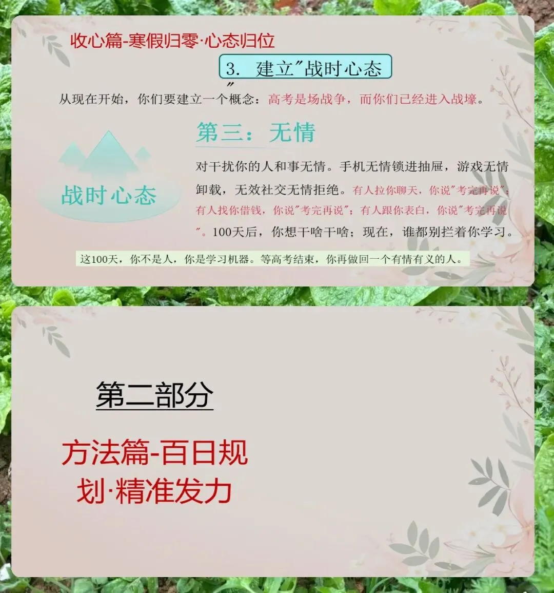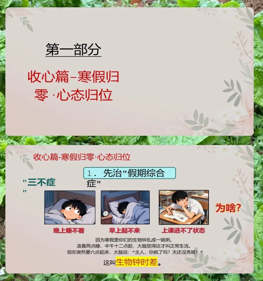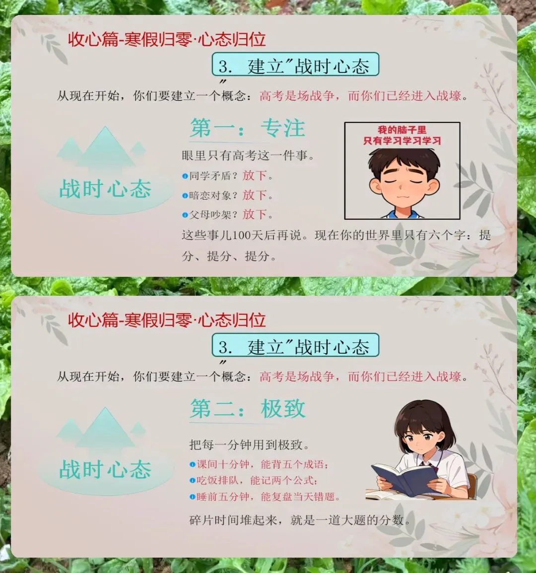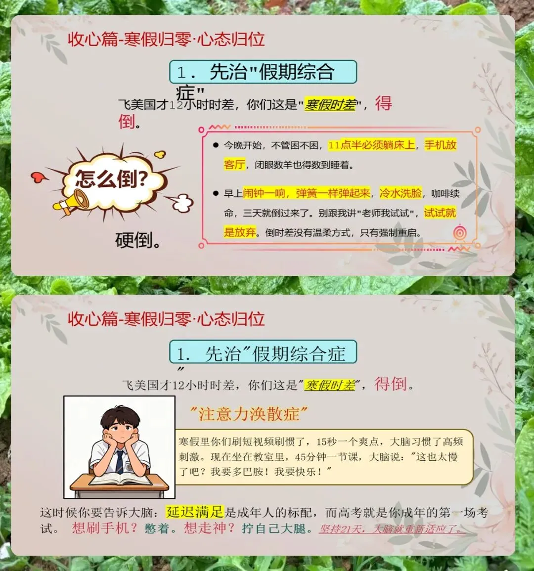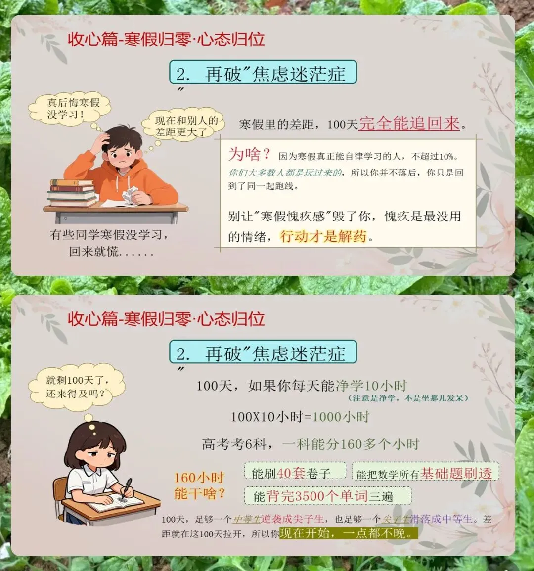 首先说收心的事,寒假过完,不少人有假期综合症,晚上睡不着,早上起不来,上课也进不了状态,还有注意力涣散的,刷惯了短视频,坐不住 45 分钟。倒时差就硬倒,今晚开始 11 点半必须睡,手机放外面,早上闹钟响就起来,三天就能调过来。注意力的事,憋住想玩手机的念头,坚持 21 天,大脑就能适应。还有人焦虑,觉得寒假没学,和别人差距大,其实寒假真正自律学的人没多少,大家基本在同一起跑线,别被愧疚感绊住,行动才有用。一百天,每天净学 10 小时就是一千小时,六科每科能分一百六十多小时,够刷卷子、背单词、补基础,现在开始一点不晚。从今天起,建立战时心态,眼里只有高考,专注提分,把碎片时间用透,课间背成语,排队记公式,还要对干扰自己的事无情,手机锁起来,游戏卸载,无效社交全推掉,这一百天,就做学习的机器。