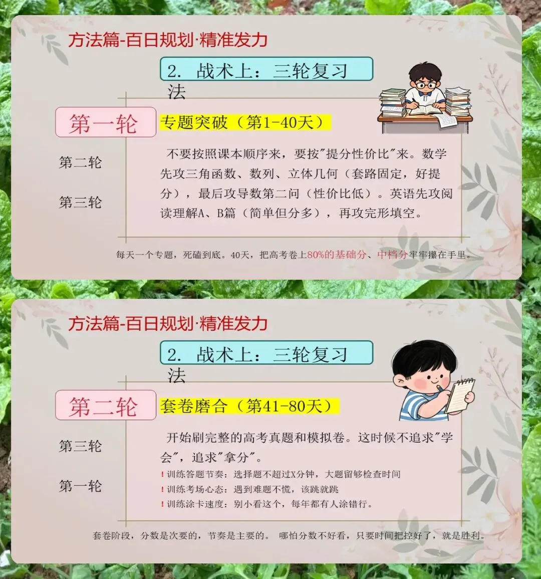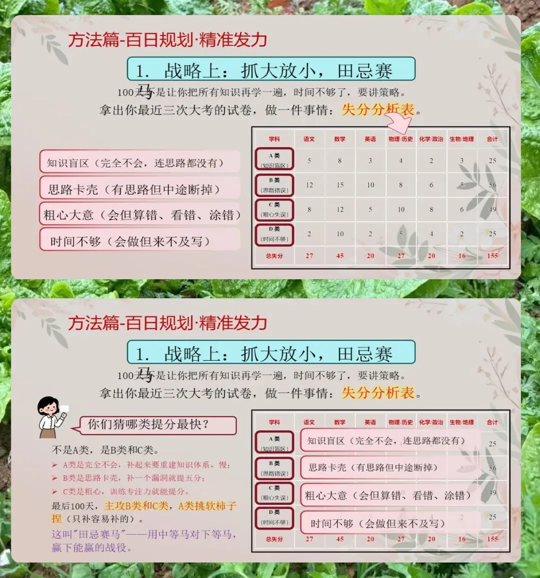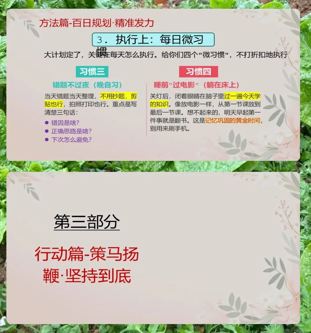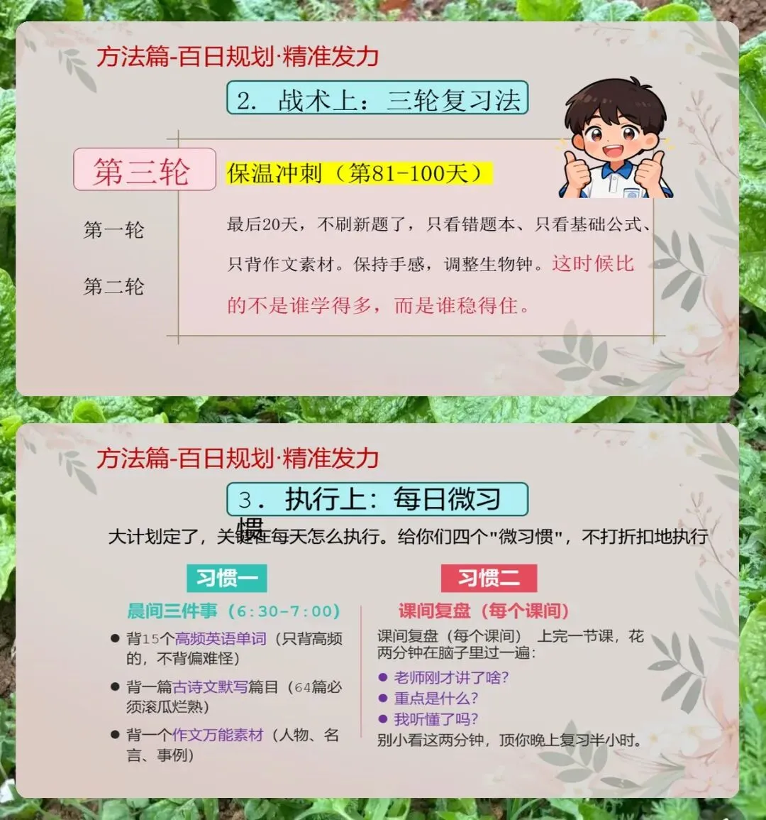 然后说怎么学,讲策略,抓大放小。拿最近三次考卷做失分分析,分知识盲区、思路卡壳、粗心、时间不够四类,重点攻思路卡壳和粗心的,这两类提分最快,知识盲区只补容易的。复习分三轮,前四十天专题突破,按提分性价比来,不按课本顺序,把基础分、中档分抓牢;四十一到八十天刷套卷,练答题节奏、考场心态和涂卡速度,分数不重要,节奏最重要;最后二十天不刷新题,看错题本、背公式素材,保持手感就行。每天的微习惯要做好,早上背单词、古诗文、作文素材,每个课间复盘课堂内容,晚自习当天错题当天整理,睡前在脑子里过一遍当天学的东西,一个都不能落。