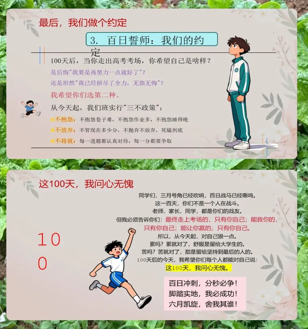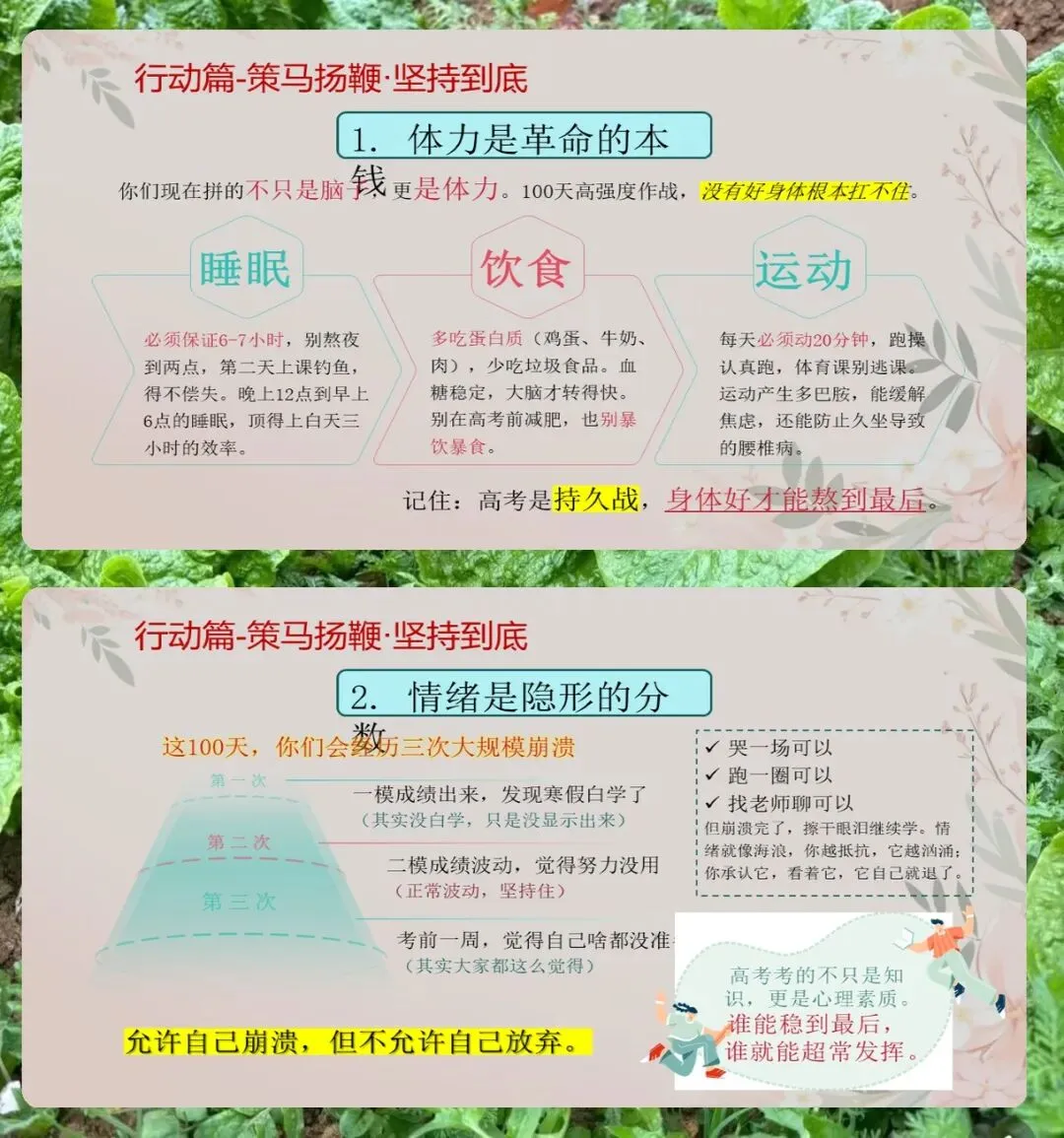 最后说行动,身体一定要跟上,每天睡六七个小时,别熬夜,每天运动二十分钟,跑操、体育课认真对待,多吃蛋白质,别吃垃圾食品。这一百天,大家肯定会崩溃几次,一模、二模,还有考前一周,崩溃了可以哭、可以跑、可以找老师聊,但不能放弃,情绪缓过来继续学,高考拼的也是心理素质。咱们班定个三不政策,不抱怨、不放弃、不将就,每道题认真做,每一分都争取。