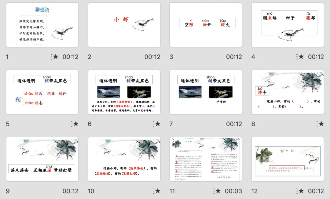 第三组:通体透明、稍带灰黑色,强调“稍”念一声的时候,表示“稍微”的意思,可以组词稍后、稍微、稍许等,念四声的时候,常见的词语只有一个——稍息,体育老师让同学们从立正姿势变为休息姿势时,会发出这个口令。(将词语送回句子读一读)孩子们听说这只虾叫做“千年虾”, 旁边那只还没起名字呢,你想给它起个什么名字?(指名说,如玻璃虾、水晶虾、蜘蛛虾等)看插图,说说图上的小虾在干什么?认读词语“搏斗”,运用形声字的规律认识“搏”字,作者不仅描写了安静时的小虾,还写出了小虾的活动。第四组:荡来荡去、互相追逐、紧贴缸壁,注意“逐”是翘舌音,把这词语填到句子里面一起读。三、发现有趣