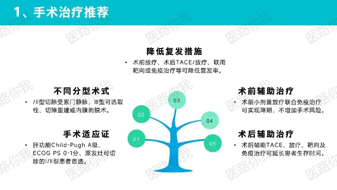 - Ⅰ/Ⅱ型患者的首选:对于原发病灶可切除的Ⅰ/Ⅱ型患者,指南强烈推荐手术切除。这不仅能切除肿瘤,还能解除门静脉高压,改善肝功能。