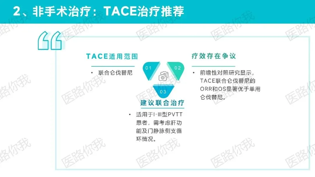 - TACE(经导管动脉化疗栓塞)的优化:TACE并非PVTT的绝对禁忌,但需谨慎用于Ⅲ/Ⅳ型患者。指南强调TACE必须与放疗、靶向及免疫治疗联用,以弥补其对门静脉血流影响大、单用疗效有限的不足。
