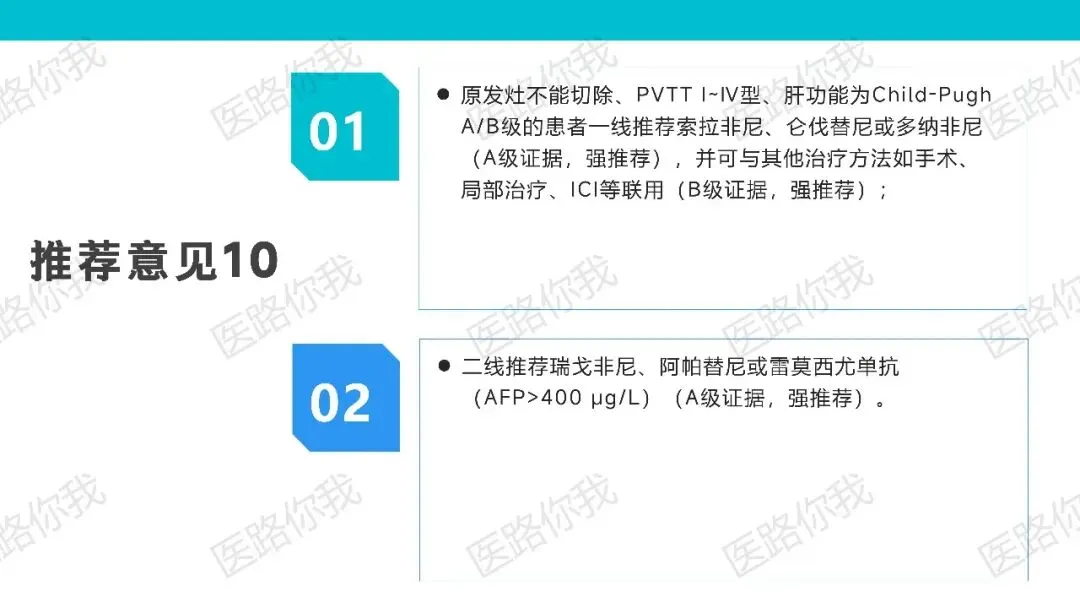 - 二线治疗:对于一线失败的患者,推荐瑞戈非尼、阿帕替尼或雷莫西尤单抗(针对AFP>400 μg/L患者)。