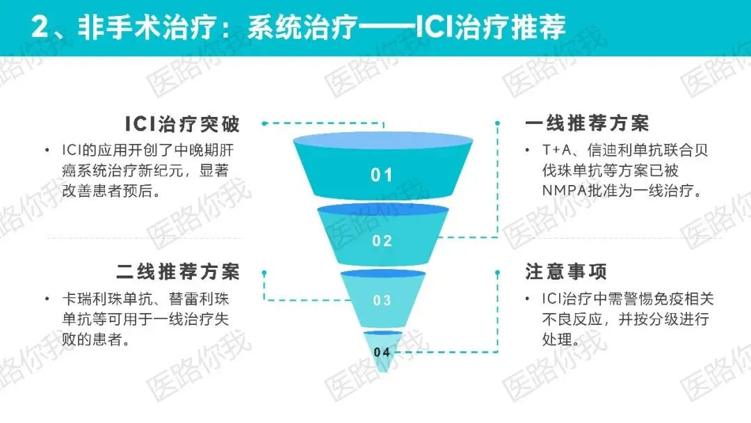 - 术后辅助治疗:为了防止“卷土重来”,术后推荐辅助性TACE、放疗,并联合靶向药物(如多纳非尼、仑伐替尼)或免疫治疗(ICI)。