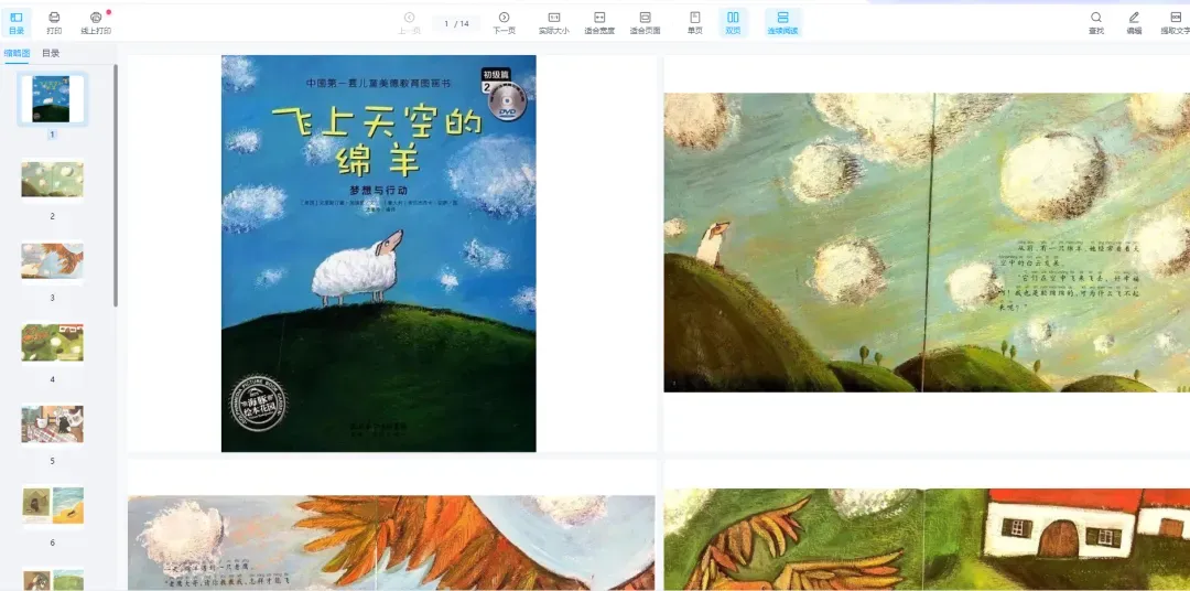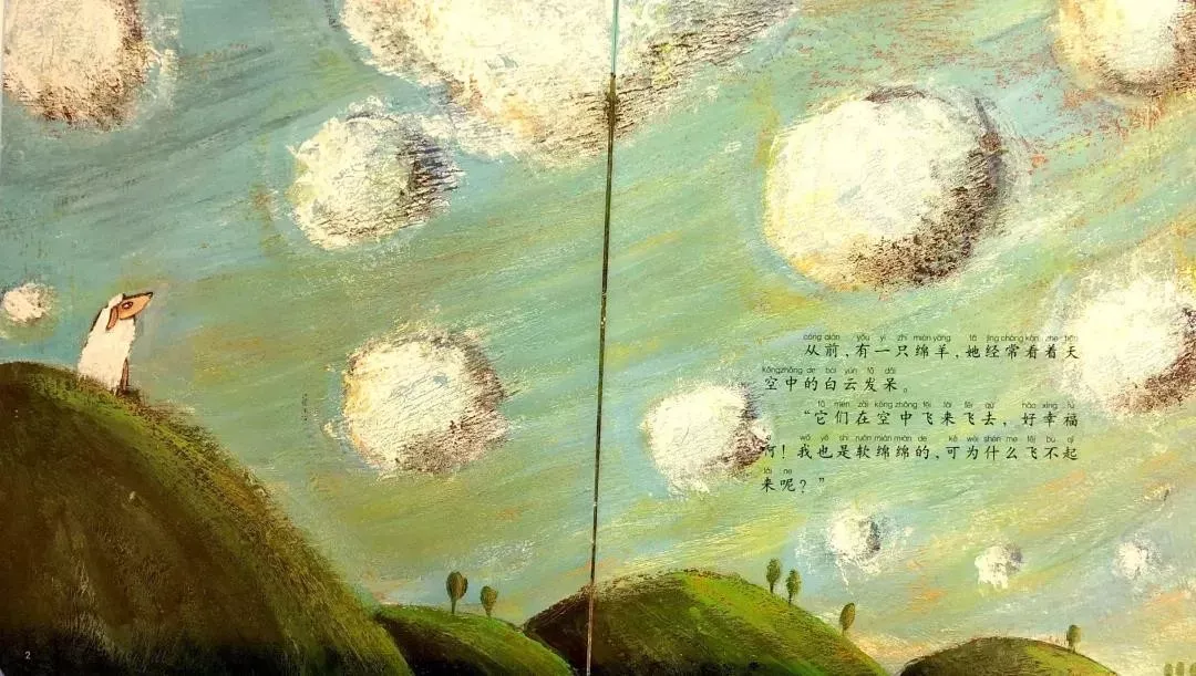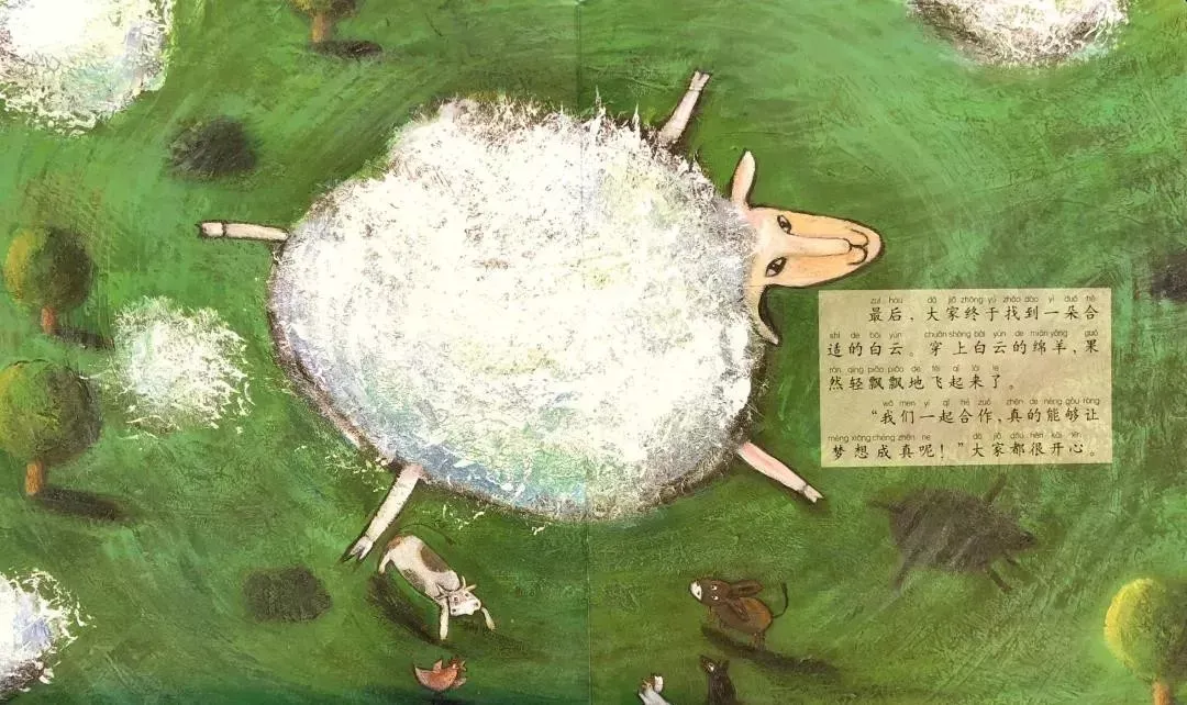 最后,大家终于找到一朵合适的白云。穿上白云的绵羊,果然轻飘飘地飞起来了。