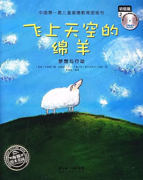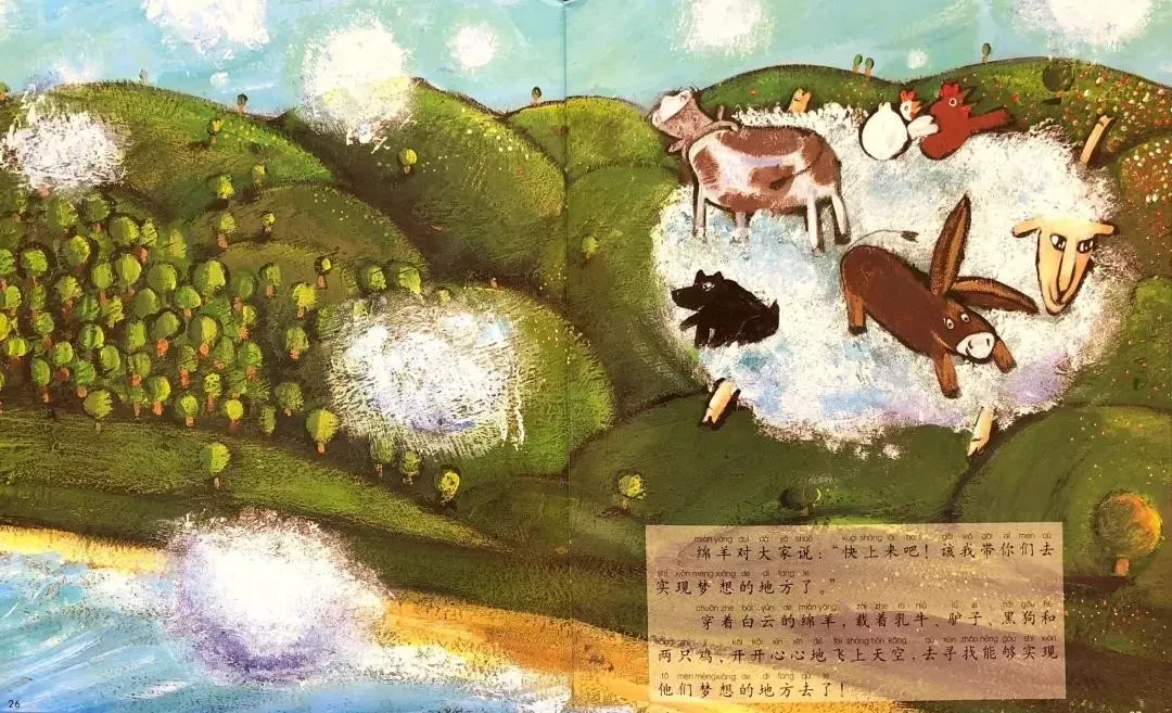 穿着白云的绵羊,载着乳牛、驴子、黑狗和两只鸡,开开心心地飞上天空,去寻找能够实现他们梦想的地方去了!