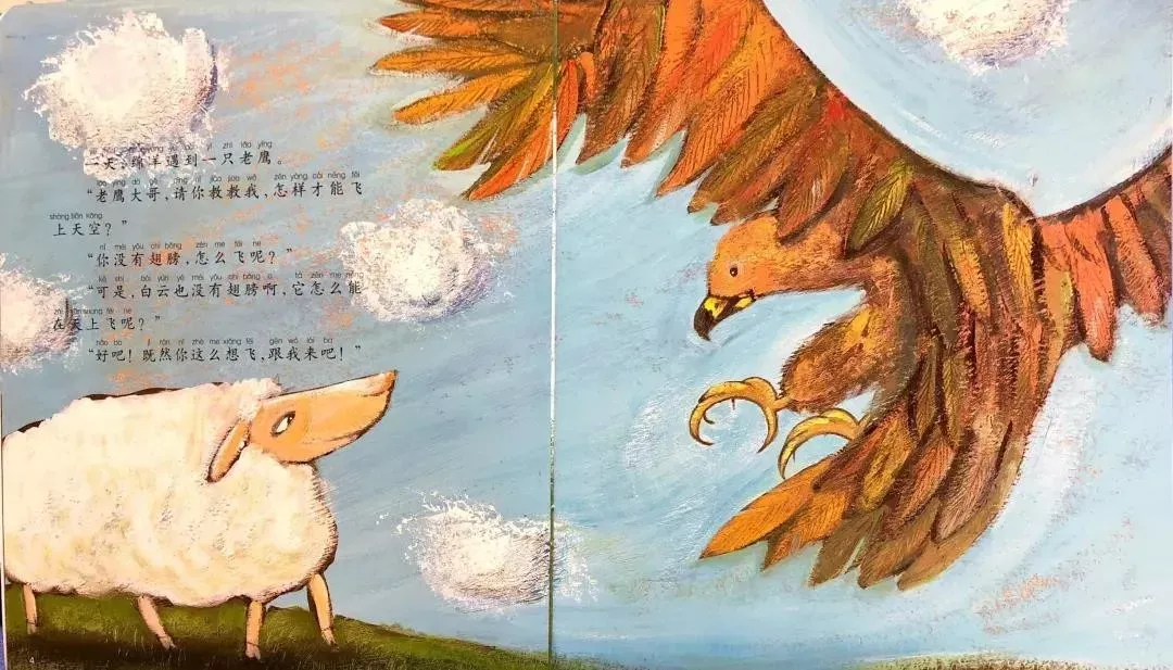 一天,绵羊遇到一只老鹰:“老鹰大哥,请你教教我,怎样才能飞上天空?”