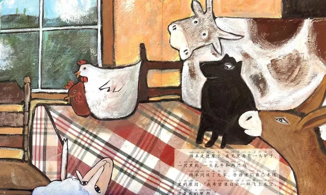 绵羊走进屋子,看见里面有一头驴子、一只黑狗、一头乳牛和两只鸡。绵羊问候了大家,告诉他们自己来这里的原因:“我希望像白云一样飞上天空,这是我的梦想。”