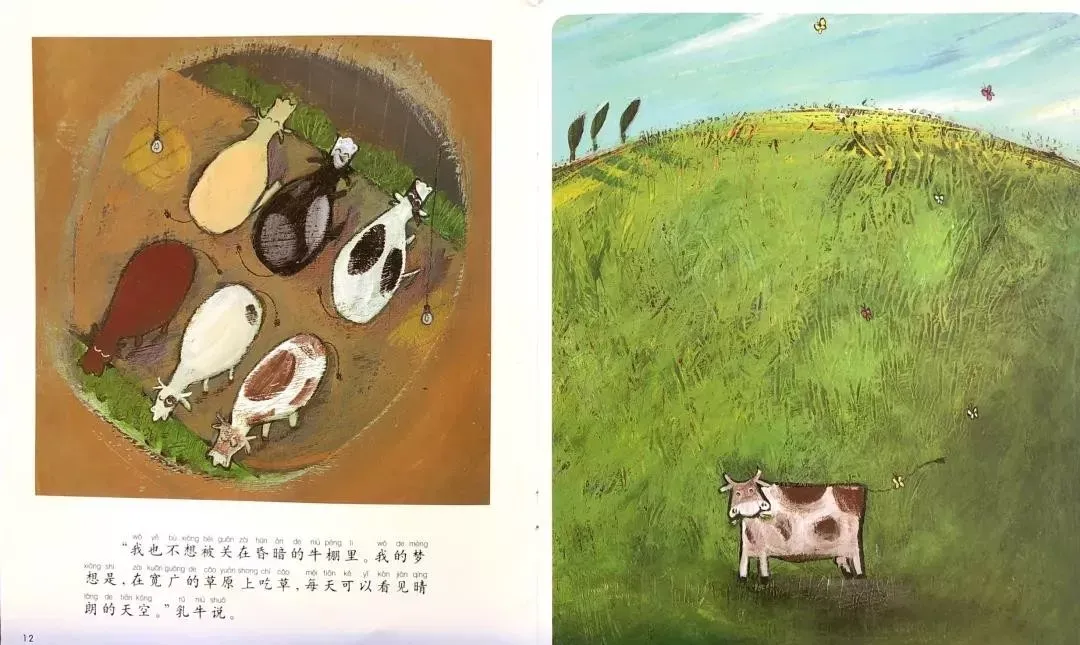 “我也不想被关在昏暗的牛棚里。我的梦想是,在宽广的草原上吃草,每天可以看见晴朗的天空。”乳牛说。