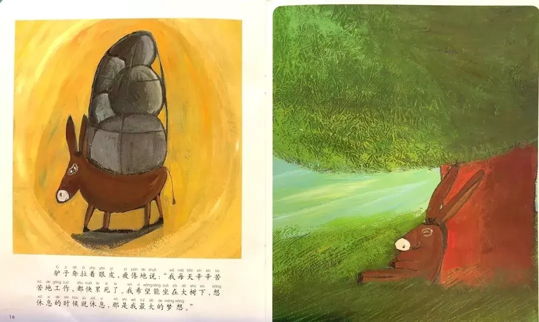 驴子耷拉着眼皮,疲倦地说:“我每天辛辛苦苦地工作,都快累死了。我希望能坐在大树下,想休息的时候就休息,那是我最大的梦想。”
