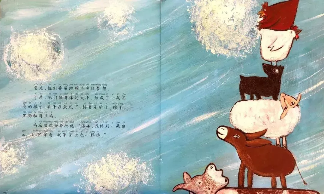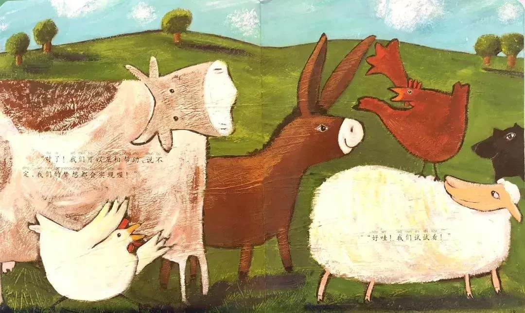 首先,他们要帮助绵羊实现梦想。于是,他们依身体的大小,组成了一架高高的梯子。乳牛在最底下,接着是驴子、绵羊、黑狗和两只鸡。