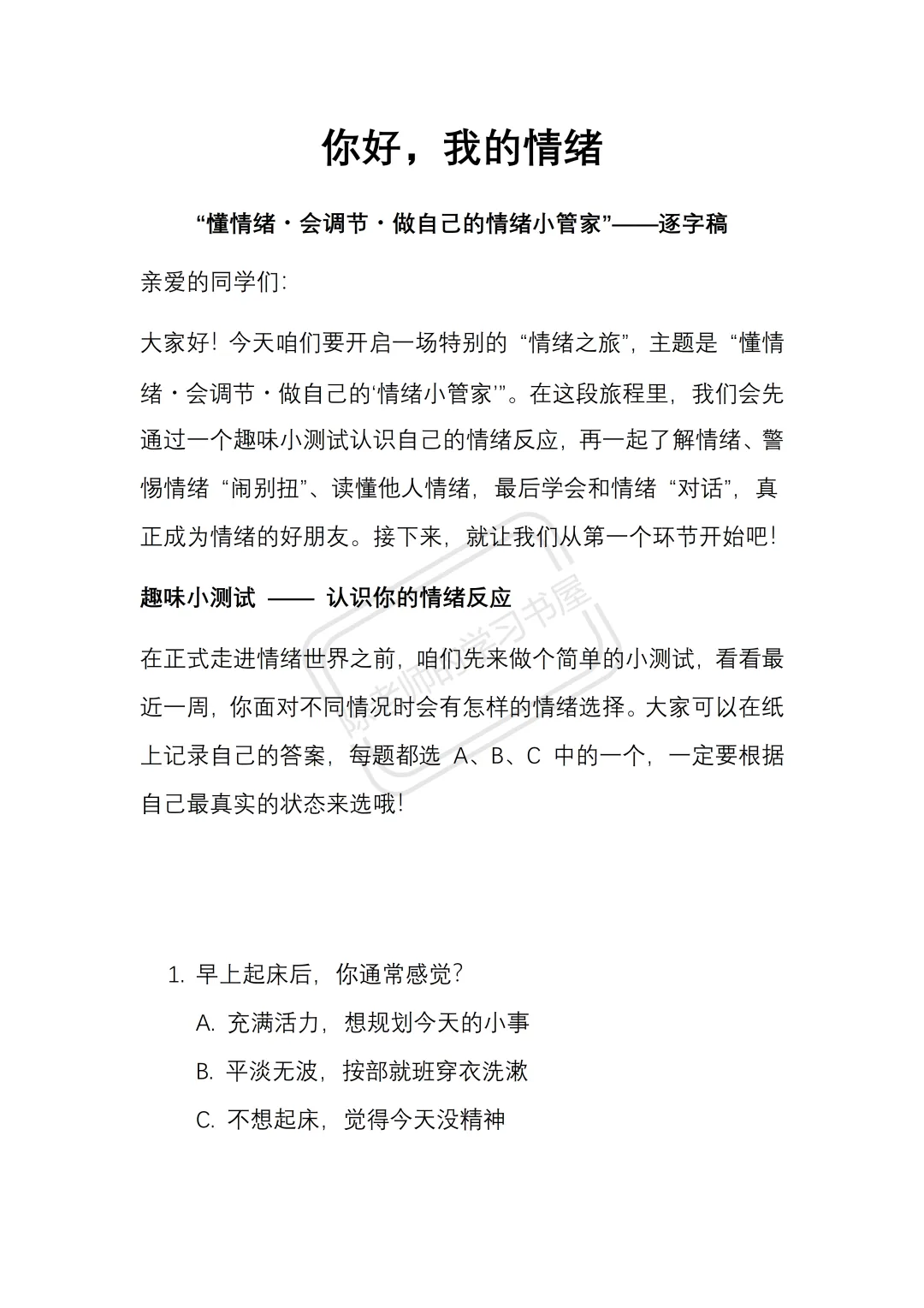 🌟专为小学心理健康课或主题班会打造,从“趣味测试”到“互动剧场”,再到“专属情绪工具箱”,38页课件层层递进,科学引导孩子识别情绪信号;15页精细教案包含逐字稿与实操指南,助老师轻松上一堂有深度、有温度的情绪管理课,让孩子学会与情绪做朋友!🤝