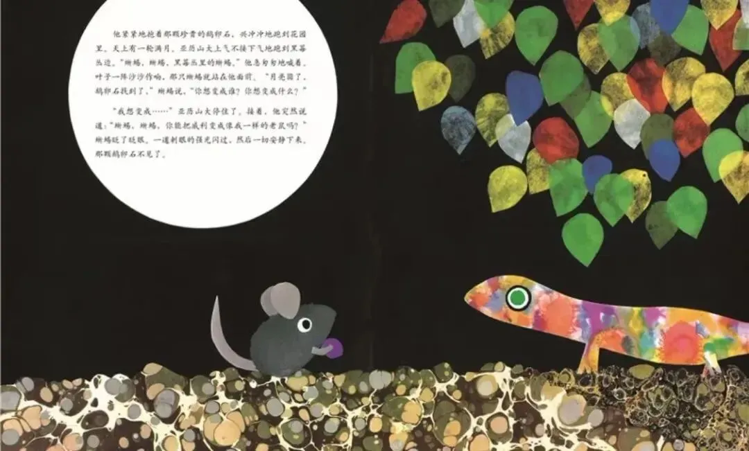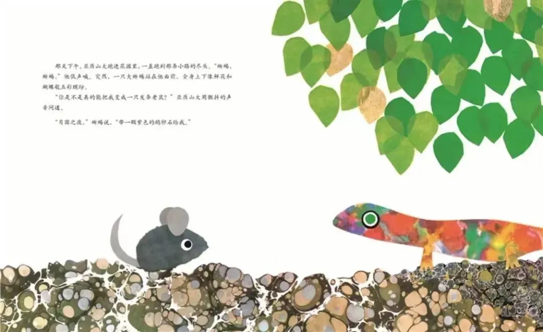 他跑进花园,小声地喊“蜥蜴、蜥蜴。”突然,一只大蜥蜴站在他面前,全身上下五彩缤纷。