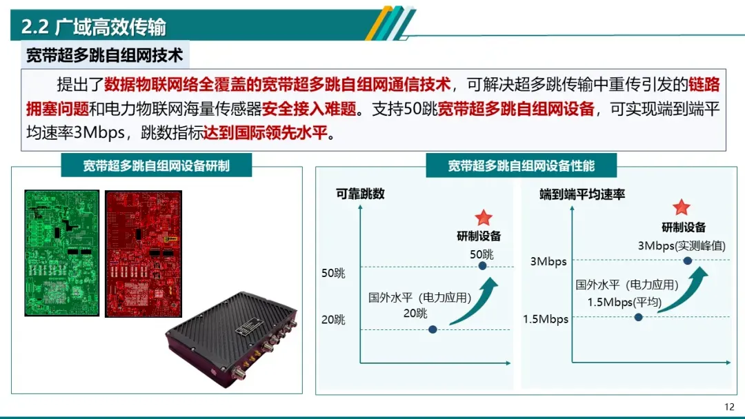 - 解决方案:提出宽带超多跳自组网技术,支持50跳传输,端到端平均速率3Mbps,达到国际领先水平。
