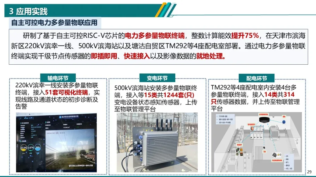 - 自主可控电力多参量物联终端:在天津市滨海新区220kV滨幸一线、500kV滨海站等场景部署,实现千级节点传感器即插即用及影像数据就地处理。