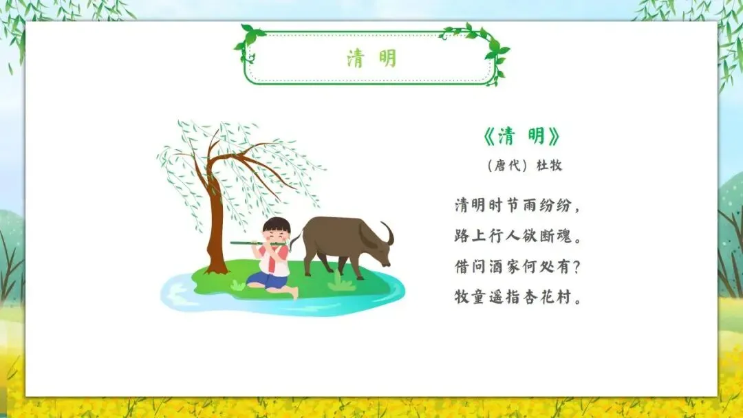 诗意清明:诗词里的春天与思念古往今来,无数文人墨客为清明留下了动人的诗篇。杜牧的 “清明时节雨纷纷,路上行人欲断魂” 道尽了清明的惆怅与哀思;韩翃的 “日暮汉宫传蜡烛,轻烟散入五侯家” 描绘了寒食节的景象。这些诗词不仅是文学瑰宝,更是我们感受清明文化魅力的窗口。