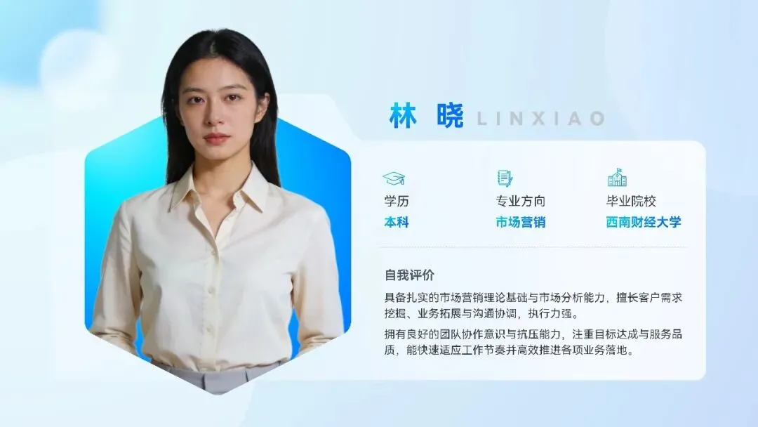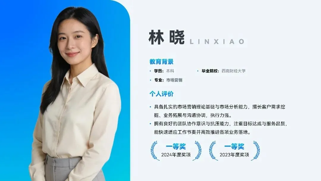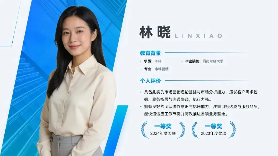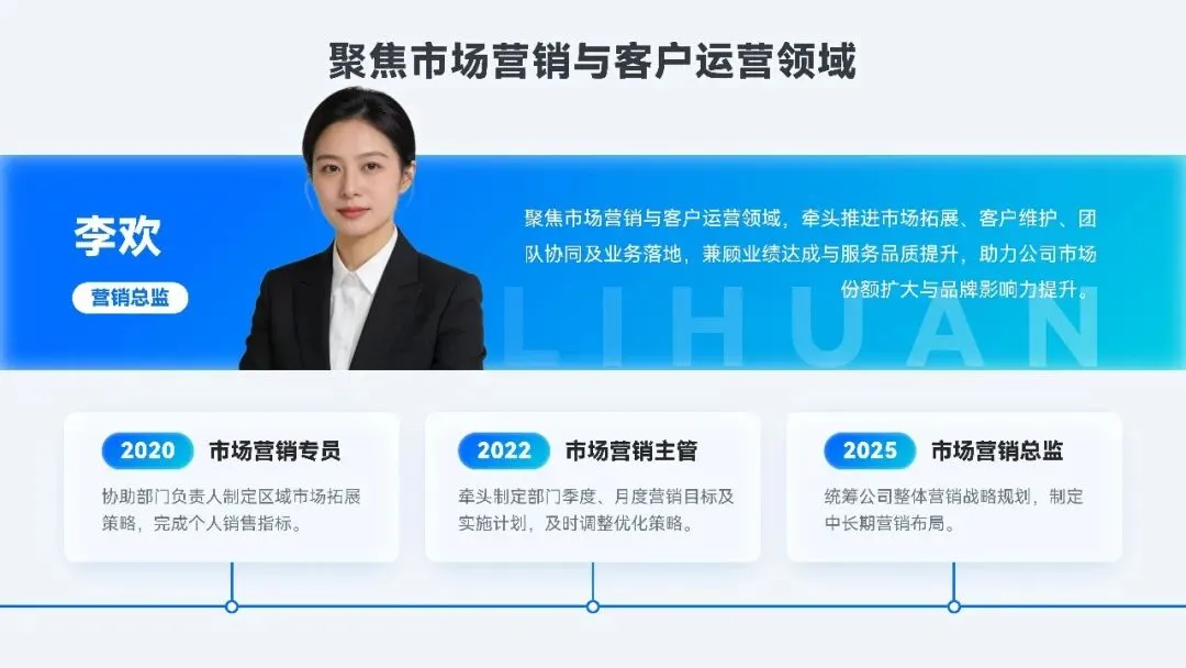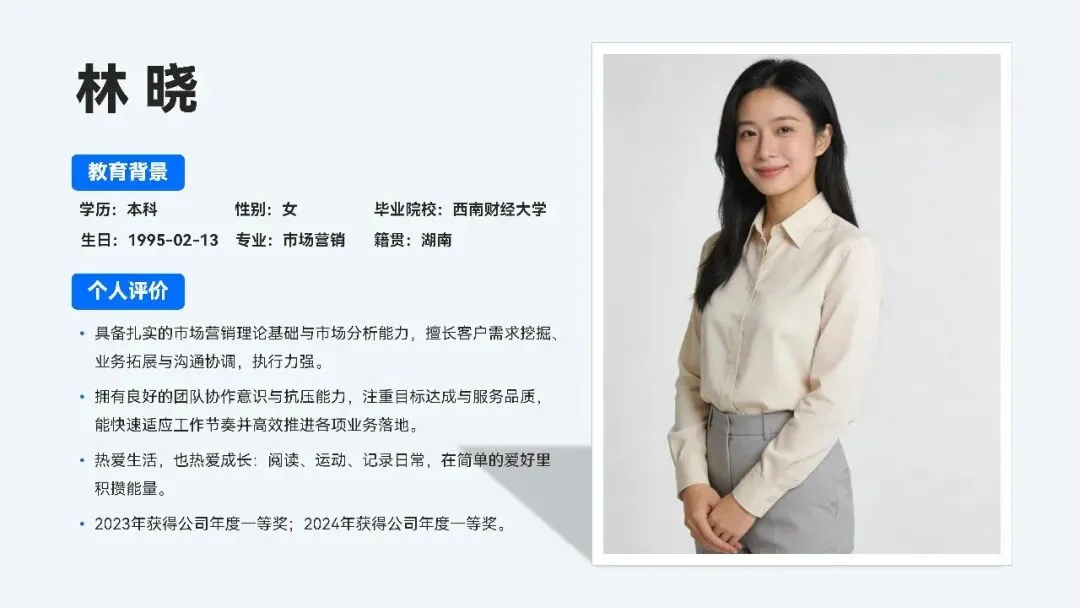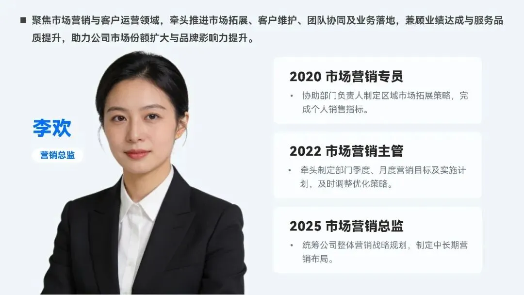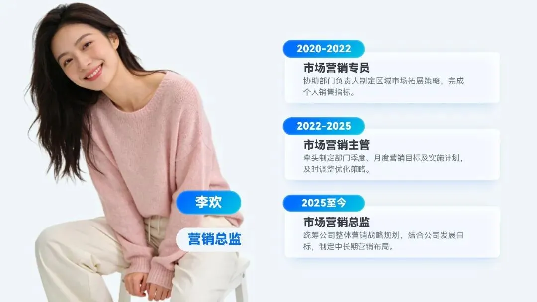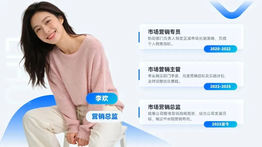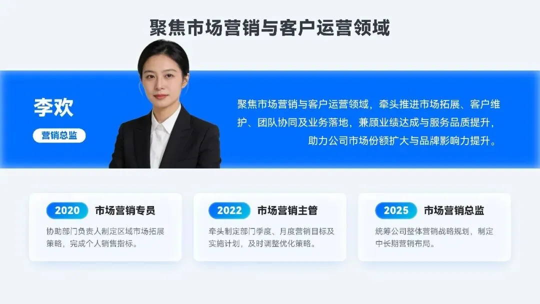 如果想要更简洁的效果,我们可以换成更加正式的照片,用简单形状承载内容,重点内容用不同颜色来强调即可。