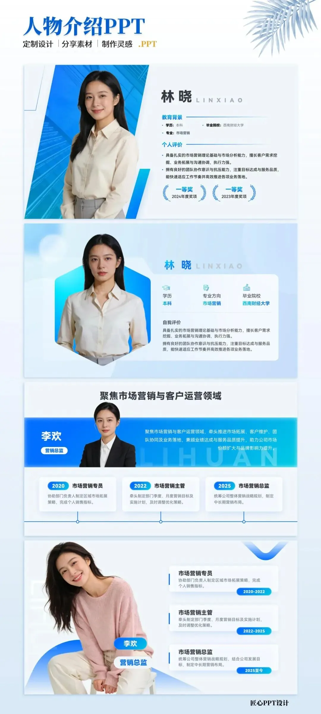 在个人述职、项目答辩、求职展示、企业介绍等等很多PPT中,都有个人介绍的部分,而且通常都在开篇,重要程度不言而喻。