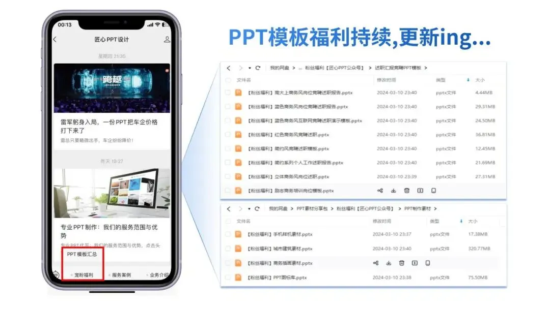 感谢大家关注公众号,赠送述职竞聘汇报PPT模板、PPT制作素材一份。