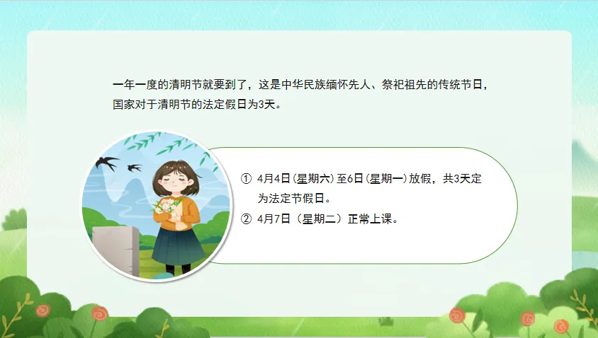 明确放假时间:4 月 4 日 —6 日放假 3 天,4 月 7 日正常上课。