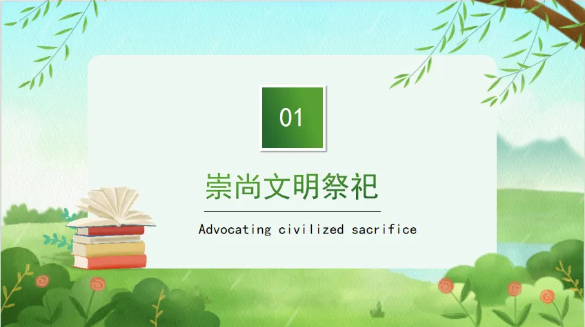 文明祭祀方式:植树、献鲜花、送花圈,不焚烧纸钱、不燃放烟花爆竹;扫墓不乱砍林木,带走垃圾,保护生态。