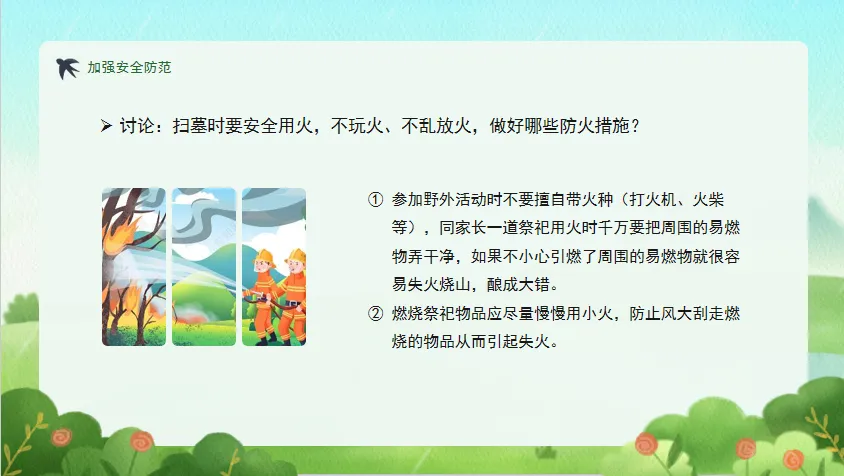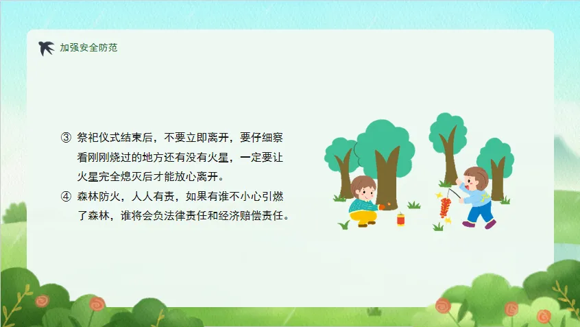 教学重点:清明防火、文明祭祀、交通安全、防溺水、居家安全。